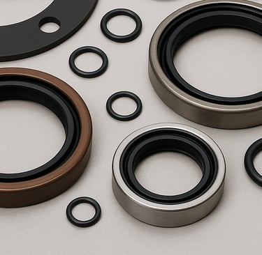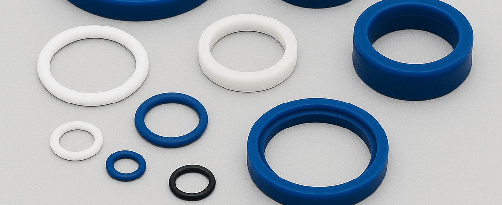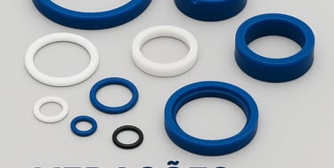 Anéis de vedação “o-ring” em borracha nitrílica, viton, silicone, etc. Reparos de cilindros hidráulicos / pneumáticos, retentores, gaxetas e raspadores em P.U., guias de nylon e anéis de teflon.